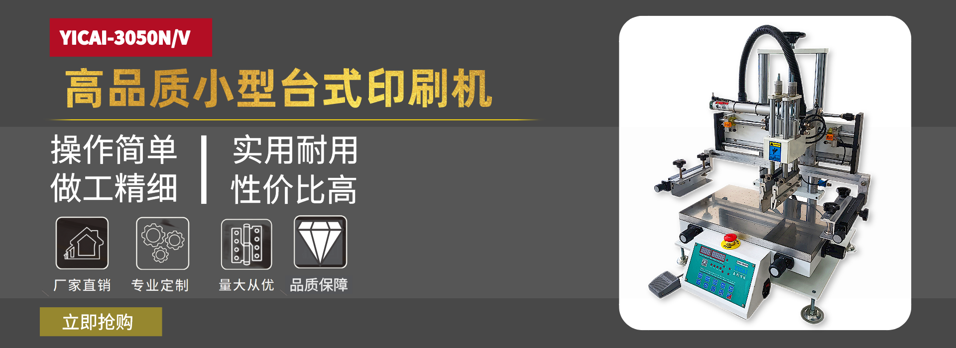 YICAI成立于一九九九年,是一家集開(kāi)發(fā)、生產(chǎn)制造和整合營(yíng)銷(xiāo)絲印、移印及周邊機(jī)械設(shè)備為一體的專(zhuān)業(yè)廠家,多年的印刷設(shè)備制造經(jīng)驗(yàn),一直致力為國(guó)內(nèi)乃至全球提供優(yōu)質(zhì)印刷器材及完善的服務(wù)體系。 為符合這個(gè)工業(yè)自動(dòng)化的社會(huì),我司在不斷的改進(jìn)下提供了多元化的印刷器材,及代理多國(guó)印刷油墨、網(wǎng)紗、膠刮、等產(chǎn)品。時(shí)至今天,我司已成功開(kāi)發(fā)并制造出了一系列全自動(dòng)絲印機(jī)、全自動(dòng)移印機(jī)、絲移印配套設(shè)備. 非標(biāo)智能化自動(dòng)化設(shè)計(jì)制造及周邊機(jī)械設(shè)備,為廣大用戶解決一直以來(lái)用工難問(wèn)題,大大提高生產(chǎn)效率降低了生產(chǎn)成本,深受廣大新老客戶的好評(píng)!...
